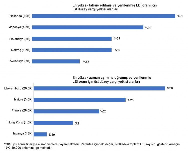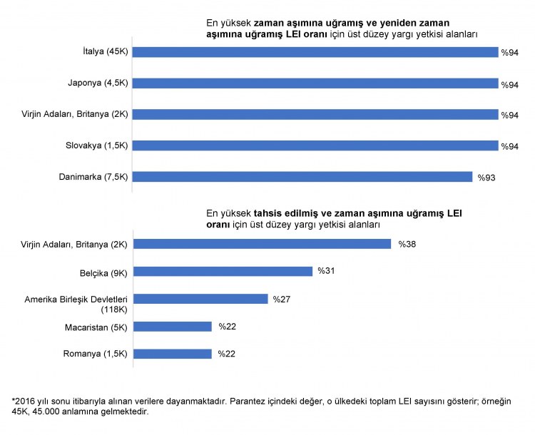Zaman aşımına uğramış ve yenilenmiş LEI oranı: Bu, 2015 yılında zaman aşımına uğramış, ancak 2016 yılında yenilenmiş olan LEI'lerin oranıdır. Bu durumda tüzel kişiler LEI'lerini ancak önceden belirlenen yenileme tarihinden sonra yenilemişlerdir.