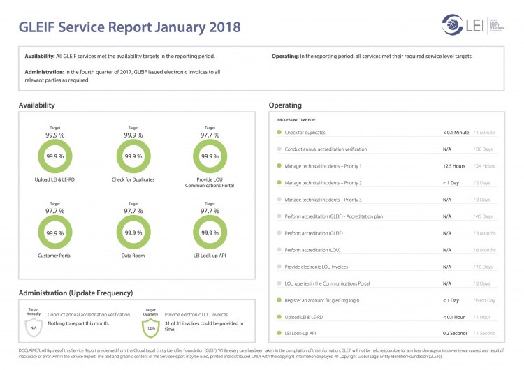Global Legal Entity Identifier Foundation (GLEIF)致力于确保其在 GLEIF 所提供服务方面绩效的透明度。因此,我们提供每月服务报告下载,以评估 GLEIF 的整体表现。