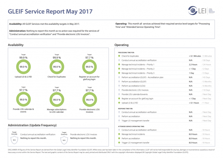 Global Legal Entity Identifier Foundation (GLEIF)致力于确保其在 GLEIF 所提供服务方面绩效的透明度。因此,我们提供每月服务报告下载,以评估 GLEIF 的整体表现。