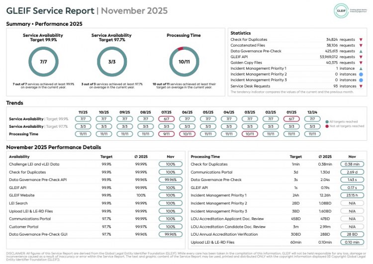 Global Legal Entity Identifier Foundation (GLEIF)致力于确保其在 GLEIF 所提供服务方面绩效的透明度。因此,我们提供每月服务报告下载,以评估 GLEIF 的整体表现。