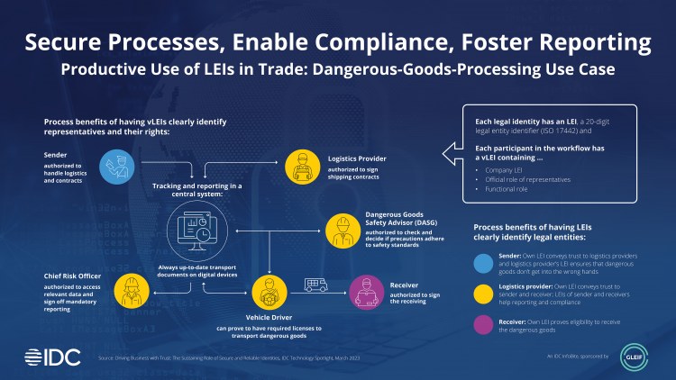 其 KTDDE 报告中的 ICC 数字标准倡议建议在出口商、进口商、金融机构和物流供应商的数字系统中使用 LEI。这将有助于开发遵守许多主要标准的数字平台。该报告还表明实体识别的重要性,即 36 份核心贸易文件中 25% 的关键数据元素都与贸易涉及的各方关联。LEI 和 vLEI 是贸易数字化的基础推动因素,提供唯一可实现全球互操作、与平台无关的组织身份识别解决方案。