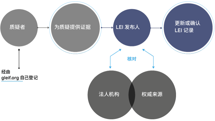 一旦使用 GLEIF 网站上提供的在线表单记录下质疑,GLEIF 会立即将该信息传达给相关的 LEI 发放组织以采取后续措施。相关 LEI 发放组织应负责与受影响的法人机构对话,最终解决问题。如有需要,在根据权威来源进行进一步验证之后,LEI 发布人将更新与 LEI 记录相关的信息。目标是在十个工作日内解决质疑。
