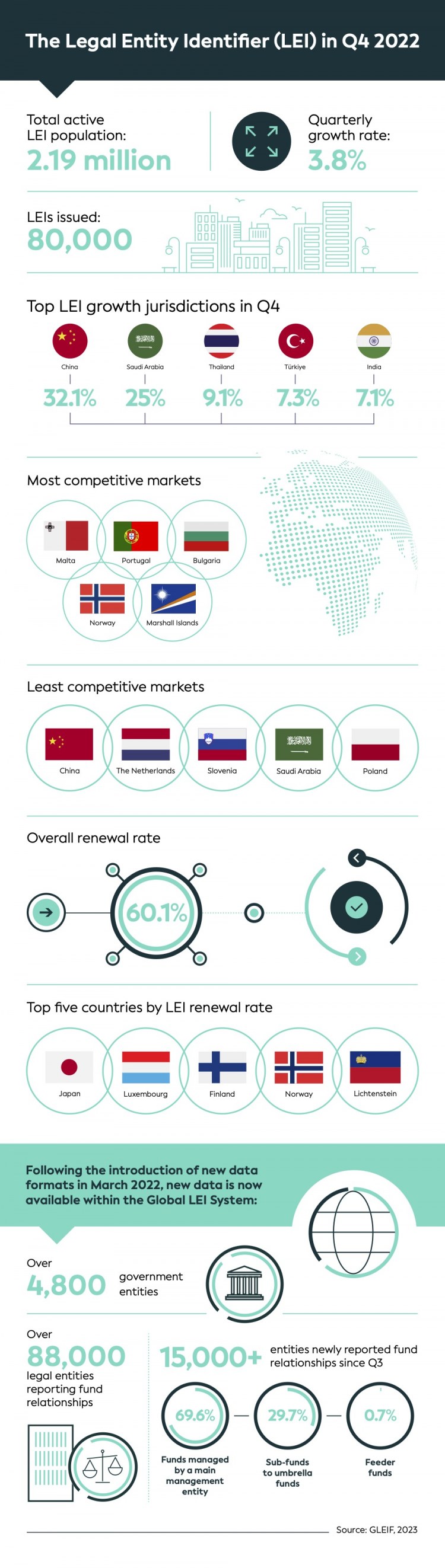 涵盖 2022 年第四季度的最新商业报告数据显示,整个季度共发放了 8 万多个 LEI — 与第三季度的 5 万个相比,呈现了强劲的增长态势。这意味着活跃的 LEI 数据量的季度增长率为 3.8%。