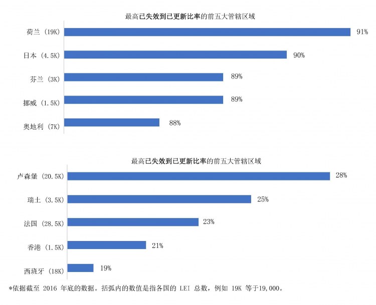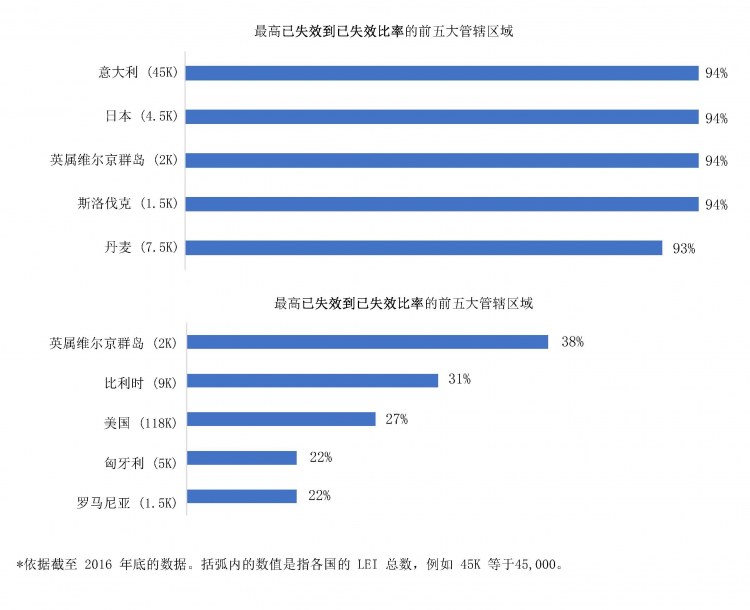 金融稳定理事会 (FSB),也就是 LEI 倡议的重要推手兼 GLEIF 的奠基者,强调 LEI 的推广应支持“金融数据较高的总体质量和准确性”。数据池实现这一目标的能力取决于,定期重新验证的可信和开放数据的可用性。如果法人机构在其 LEI 参考数据的“下次更新指定日期“前未能更新和再认证其 LEI 注册,则此 LEI 的注册状态将从“已发放”设为“已失效”。 截至 2017 年 3 月,全部 LEI 失效用户会达到约 30%,这基本上反应了从 2015 年初以来我们所观察到的失效比率。