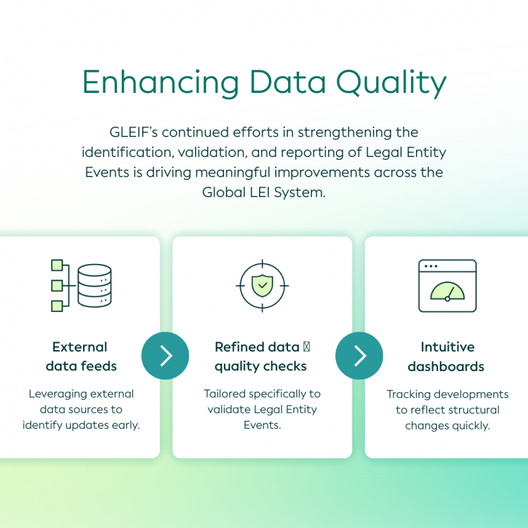 GLEIF 致力于加强对法定实体事件的识别、验证和报告。通过利用外部数据源、完善针对法定实体事件的数据质量检查以及通过开放、直观的仪表板跟踪新发展等举措,LEI 记录的精确性和一致性正在不断提高: